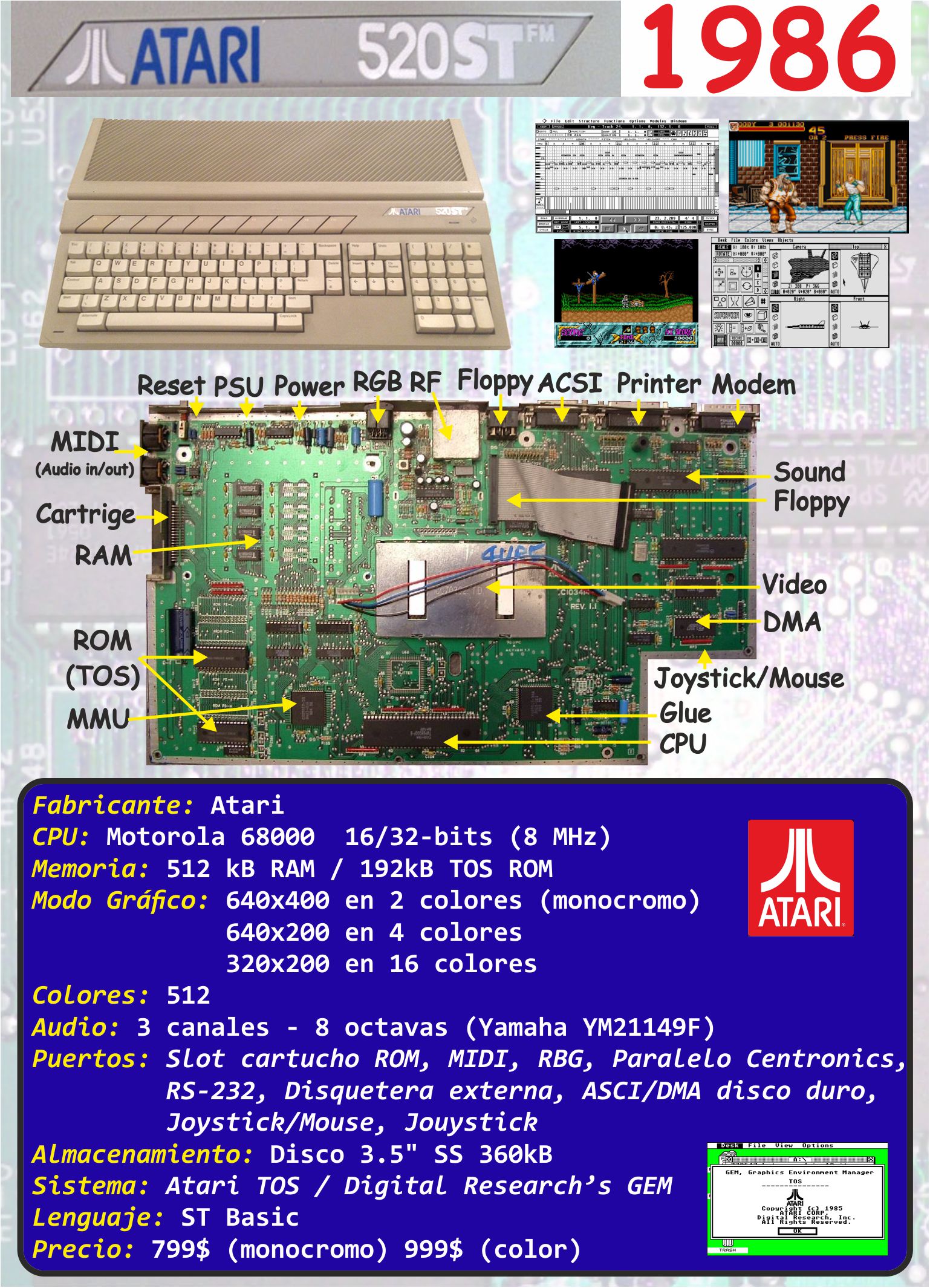 | Puertos: | Slot cartucho ROM, MIDI, RBG, Paralelo Centronics, RS-232, Disquetera externa, ASCI/DMA disco duro, Joystick/Mouse, Jouystick |