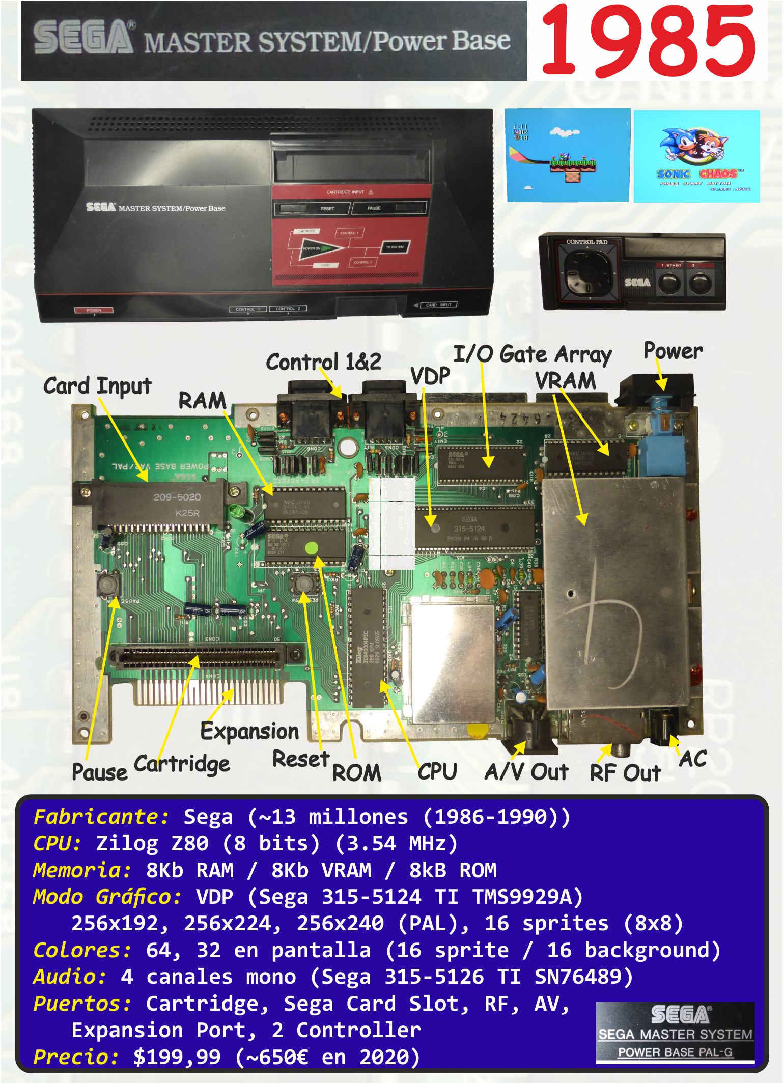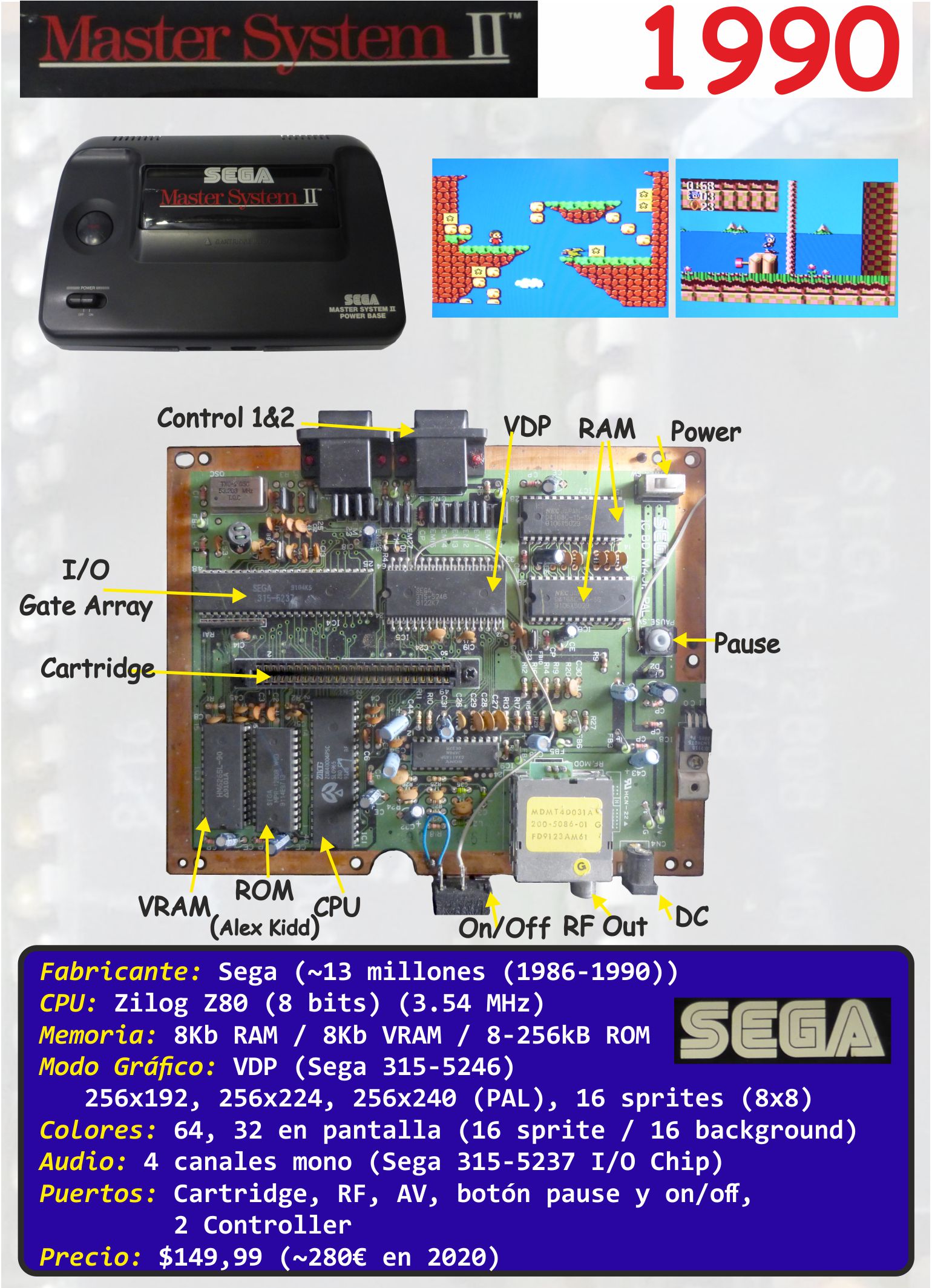 Fichas: SEGA abril 30, 2021 rosbaldo Modelos Disponibles: Fichas: Sega Master System I (1986) Modelo: Fabricante:Sega Año:1986 Producción:~13 millones (1986-1990) CPU:Zilog Z80 (3.54 MHz) (8 bits) RAM:8Kb (VRAM: 16Kb ROM:8-256Kb (según cartucho) Modo Gráfico:VDP (Sega 315-5124 TI TMS9929A) 256x192, 256x224, 256x240 (PAL), 16 sprites (8x8) Colores:64 colores, 32 en pantalla (16 sprite / 16 background) Almacenamiento:Cartuchos / Sega Cards Audio:4 canales mono (Sega 315-5126 TI SN76489) Puertos:Cartridge, Sega Card Slot, RF, AV, Expansion Port, 2 Controller Batería:9V DC Sega Master System II (1990) Modelo: Fabricante:Sega Año:1990 CPU:Zilog Z80 (3.54 MHz) (8 bits) RAM:8Kb (VRAM: 16Kb ROM:8-256Kb (según cartucho) Modo Gráfico:VDP (Sega 315-5246) 256x192, 256x224, 256x240 (PAL), 16 sprites (8x8) Colores:64, 32 en pantalla (16 sprite / 16 background) Almacenamiento:Cartuchos Audio:4 canales mono (Sega 315-5237 I/O Chip) Puertos:Cartridge, RF, AV, botón pause y on/off, 2 Controller Batería:9V DC Sega Mega Drive I (1990) Modelo: Fabricante:Sega Año:1990 Producción:~31 millones 1988-1995 CPU:Motorola 68000 (7.61 Mhz) (16 bits) RAM:64Kb (VRAM: 64Kb ROM:2Kb Modo Gráfico:VDP (SEGA 315-5313A) 320x224, 256x224, 320x240 (PAL), 80/64 sprites Colores:512, 61 en pantalla Almacenamiento:Cartuchos Audio:8 bits, 6 canales FM (Yamaha YM2512), 4 canales PSG (TI SN76489) Puertos:Cartridge, DIN8 RGB/Audio Mono/Video, RF, audio out stereo, bus expansión, 2 Controller Batería:9V-10V DC Sega Game Gear (1991) Modelo: Fabricante:Sega Año:1991 Producción:1990-1997 ~10.6 millones CPU:Zilog Z80A (3.58 MHz) (8 bits bits) RAM:8Kb SRAM (VRAM: 16Kb VRAM Modo Gráfico:VDP(Sega custom LSI (CPU+VDP+SCA)) 160x144 64 sprites (8x8,8x16) Colores:4096, 32 en pantalla Audio:(SN76489) 4 canales 8 voces Puertos:Cartridge/TV Tuner, DC9V, jack (stereo), gear-to-gear, speaker(mono), Power, Volume, Brightness, D-Pad, Start, 1&2 button Pantalla:3.2" LCD Color Back-Light Batería:6xAA (DC9V 300mA) Peso:400g Sega Mega Drive II (1993) Modelo: Fabricante:Sega Año:1993 Producción:1993-1995 CPU:Motorola 68000 (7.61 Mhz) (16 bits) RAM:64Kb (VRAM: 64Kb ROM:2Kb Modo Gráfico:VDP (SEGA 315-5660) 320x224, 256x224, 320x240 (PAL), 80/64 sprites Colores:512, 61 en pantalla Almacenamiento:Cartuchos Audio:8 bits, 6 canales FM (Yamaha Ym3438 FM), 4 canales PSG (TI 76489) Puertos:Cartridge, Mini-DIN9 RGB/Audio Stereo/Video, bus expansión, 2 Controller Batería:9V-10V DC