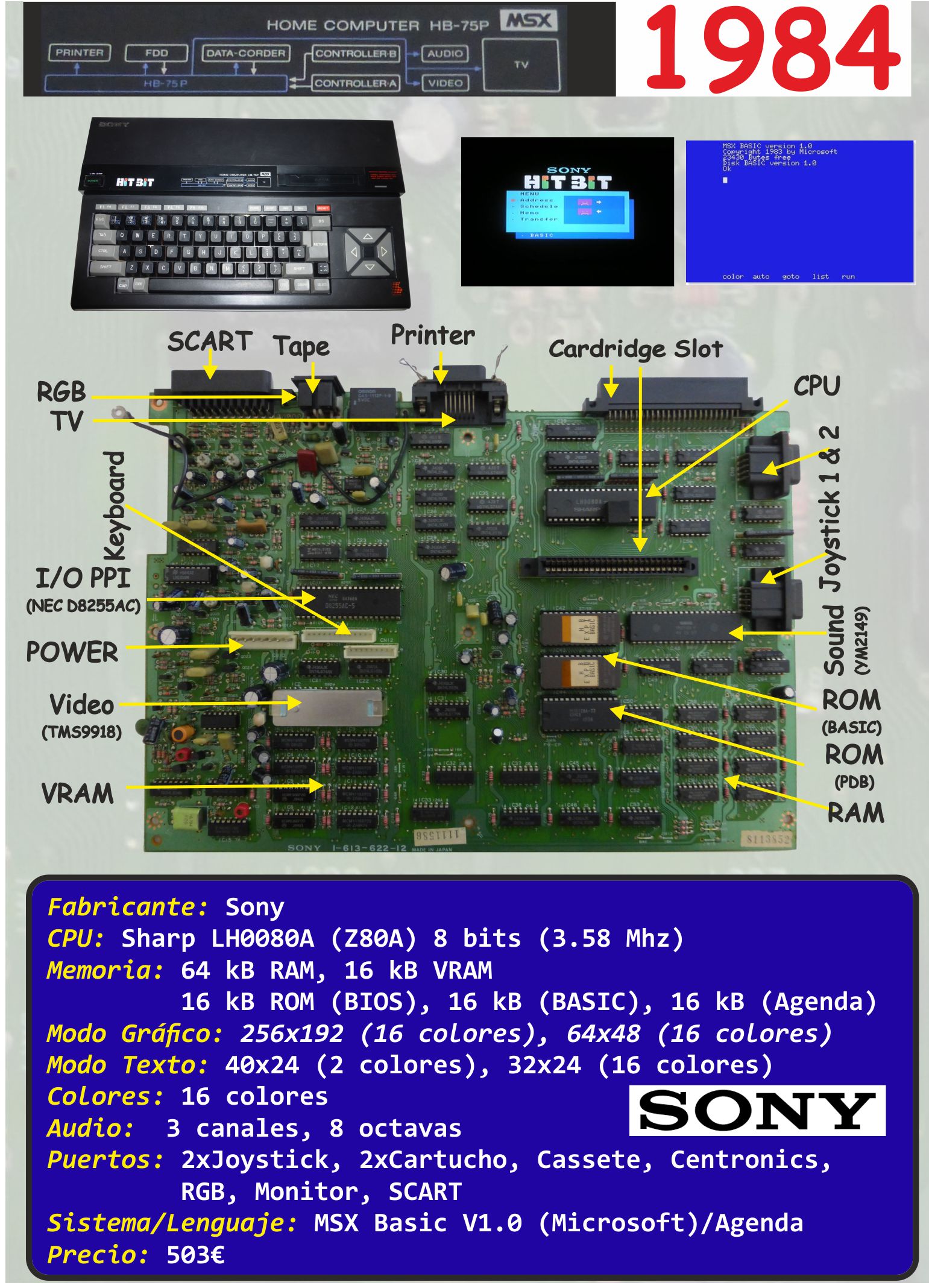 | Puertos: | 2xJoystick, 2xCartucho, Cassete, Centronics, RGB, Monitor, SCART |